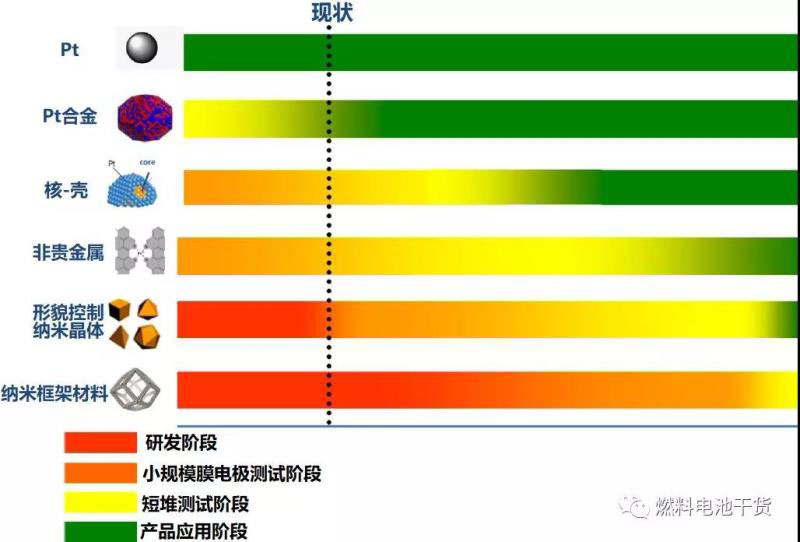 在過(guò)去的近十年內(nèi),已開(kāi)發(fā)了多種有潛在應(yīng)用的陰極ORR催化劑,這些催化劑可大致分為:Pt/C催化劑、Pt合金催化劑、核-殼催化劑、非貴金屬催化劑、形貌控制納米晶體催化劑、納米框架催化劑。上述均為擔(dān)載型催化劑(催化劑擔(dān)載在碳載體或其他納米材料商)。由于3M公司開(kāi)發(fā)的NSTF催化劑產(chǎn)品已停產(chǎn),且NSTF催化劑結(jié)構(gòu)獨(dú)立、無(wú)聚合物,不在本次討論之類。各種催化劑的大致開(kāi)發(fā)和應(yīng)用進(jìn)展如下圖所示。注意,僅從車用角度看,非貴金屬催化劑可能因不符合性能、耐久性、穩(wěn)定性和功率密度要求,被認(rèn)為距離商用化應(yīng)用最遠(yuǎn)。但非貴金屬催化劑已接近便攜式電源應(yīng)用要求。從工業(yè)或商用角度看,每種催化劑都有其優(yōu)缺點(diǎn)。
