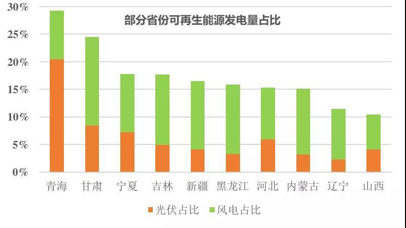 截止2019年9月底,共14個省的風、光裝機超過當?shù)乜傃b機占比的20%;