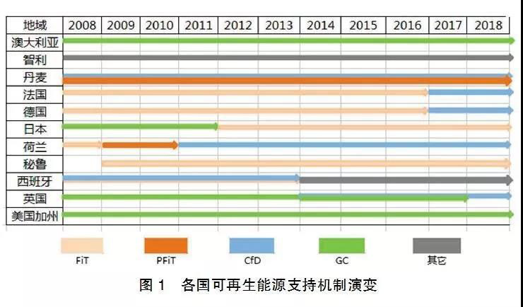 雖然各國采取的激勵機制存在不同,但仍存在一些普遍性規(guī)律:一是所有機制在某種程度上都能有效促使新容量建成,但前提是機制需提供足夠高的支持力度,保障投資者收益;二是部分國家使用固定上網(wǎng)電價作為早期支持機制,其概念和設(shè)計簡單,回報穩(wěn)定,發(fā)電商面臨的風(fēng)險最低,隨著技術(shù)的逐步成熟,支持機制也隨之變化,但不論如何改變,好的機制設(shè)計確保了新、舊機制之間的延續(xù)性,并且新機制不追溯存量電站;三是隨著可再生能源比重越來越高,政府財政補貼的壓力越來越大,越來越多的國家轉(zhuǎn)向差價合約機制。四是政府沒有明確的支持政策和配套政策,或者政策大起大落,都將導(dǎo)致可再生能源發(fā)展受阻。如圖1所示。
