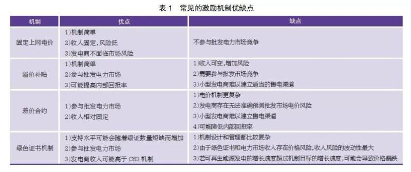 縱觀世界各國,常見的財政激勵措施有四種,即固定上網(wǎng)電價、溢價補貼、價差合約、綠證證書制度。(四種機制的優(yōu)缺點如表1所示)