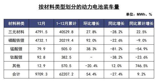 2019年,我國(guó)動(dòng)力電池裝車(chē)量累計(jì)62.2GWh,同比累計(jì)增長(zhǎng)9.2%。其中,三元電池裝車(chē)量累計(jì)40.5GWh,占總裝車(chē)量65.2%,同比累計(jì)增長(zhǎng)22.5%;磷酸鐵鋰電池裝車(chē)量累計(jì)20.2GWh,占總裝車(chē)量32.5%,同比累計(jì)下降9.0%。