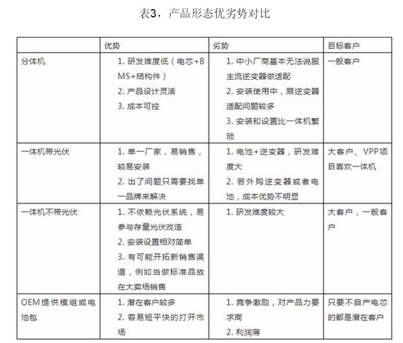 再來(lái)看產(chǎn)品路線。具體來(lái)說(shuō)大致有四種:分體機(jī),一體機(jī)帶光伏,一體機(jī)不帶光伏,OEM提供模組或pack。市場(chǎng)上代表性的產(chǎn)品舉例如下: