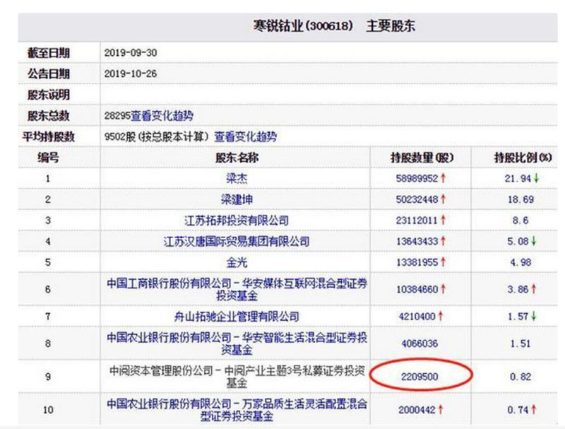 根據(jù)中國經(jīng)濟(jì)網(wǎng)記者查詢,截至2019年三季度末,中閱資本管理股份公司-中閱產(chǎn)業(yè)主題3號私募證券投資基金出現(xiàn)在寒銳鈷業(yè)的前十大股東中,該私募基金持有寒銳鈷業(yè)220.95萬股,持股比例為0.82%,為寒銳鈷業(yè)第九大股東。