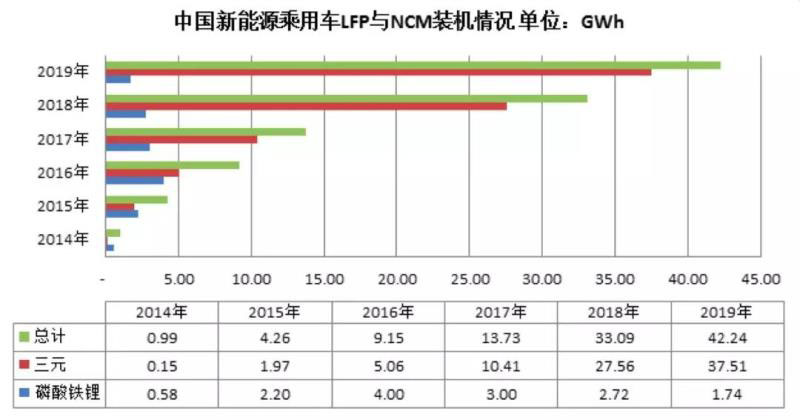高工產(chǎn)業(yè)研究院(GGII)數(shù)據(jù)顯示,從中國新能源乘用車電池裝機量情況看,2014年至2019年,LFP從2016年達到4GWh的裝機量頂峰,連續(xù)三年不斷下滑,2019年裝機量僅1.74GWh,與三元相差超過21倍。