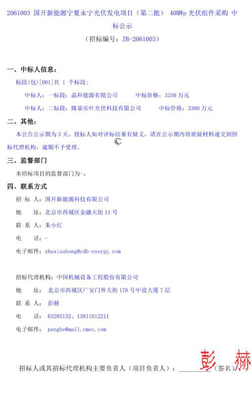 2月24日,國開新能源寧夏永寧光伏發(fā)電項目(第二批) 40MWp光伏組件采購中標(biāo)結(jié)果公示。一標(biāo)段中標(biāo)人為晶科能源有限公司(以下簡稱“晶科能源”),二標(biāo)段中標(biāo)人為隆基樂葉光伏科技有限公司(以下簡稱“隆基樂葉”)。