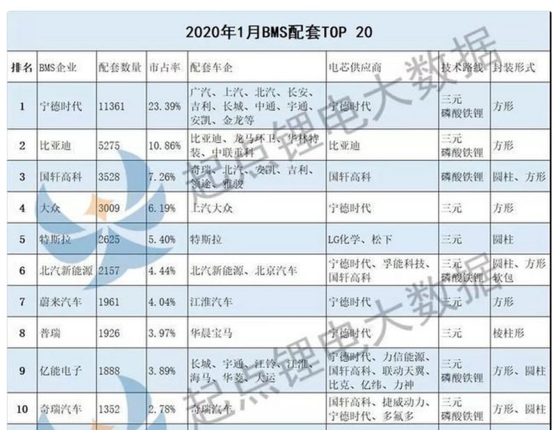 2020年1月份BMS配套TOP20企業(yè)分別是:寧德時代/比亞迪/國軒高科/大眾/特斯拉/北汽新能源/蔚來汽車/普瑞/億能電子/奇瑞汽車/電裝/科易新動力/法可賽/東軟睿馳/孚能科技/宏景電子/上海捷能/威睿電動/河南速達/威馬汽車。具體如下圖所示: