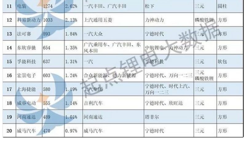 動力電池企業(yè)只占3家,但市占率合計達到31.96%。并且,排名第二的比亞迪計入車企而不計入動力電池企業(yè)。這3家電池企業(yè)分別是寧德時代(第1),國軒高科(第3)、孚能科技(第15)。