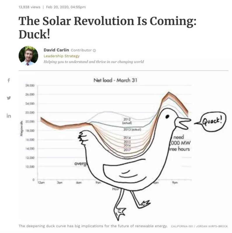 福布斯網(wǎng)站發(fā)表署名David Carlin的文章,題目是:The Solar Revolution Is Coming: Duck! 前一句的意思是“太陽能革命正在到來”,這里Duck是雙關(guān)語:一方面是指太陽能光伏帶來的負荷“鴨子”曲線,另一方面是指如何因勢利導(dǎo)應(yīng)對這個鴨子曲線。