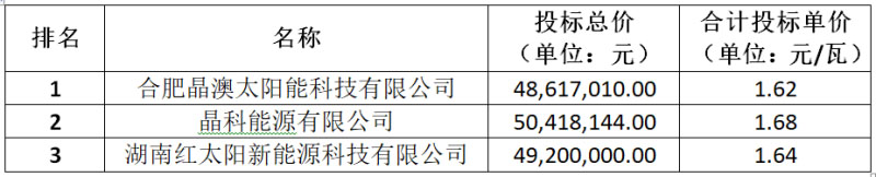 2月26日,中核山東能源貴州省盤州經(jīng)濟開發(fā)區(qū)30MWp分布式發(fā)電項目組件設(shè)備國內(nèi)公開招標(biāo)中標(biāo)候選人公示。合肥晶澳太陽能科技有限公司以48617010元的投標(biāo)總價,單價1.62元/瓦位列第一中標(biāo)候選人。