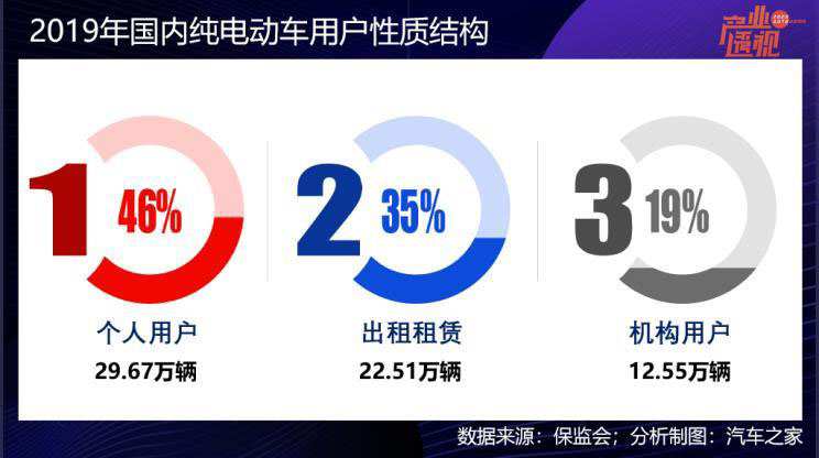 交強(qiáng)險數(shù)據(jù)顯示,2019年國內(nèi)純電動汽車的個人用戶比例占46%,出租租賃占比35%。個人用戶里也不排除個人購買但是用于跑網(wǎng)約車的,最樂觀估計,個人用戶約有四成的購買比例,而北京、上海這兩大限購限行城市是個人購買最多的地區(qū)。