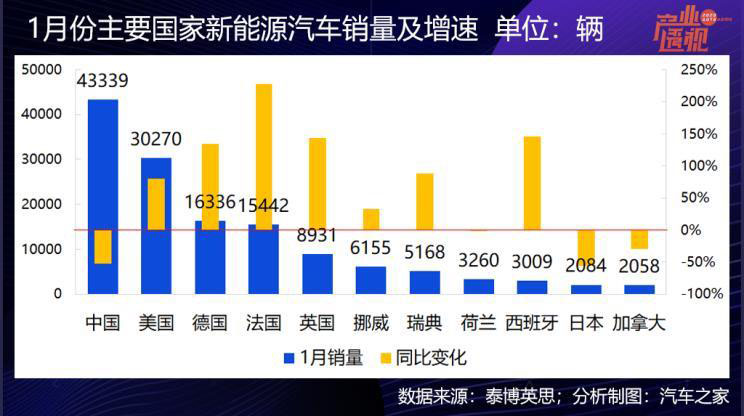 2、歐美市場開年紛紛提速,德國和法國的銷量同比漲幅分別高達(dá)134%和228%;