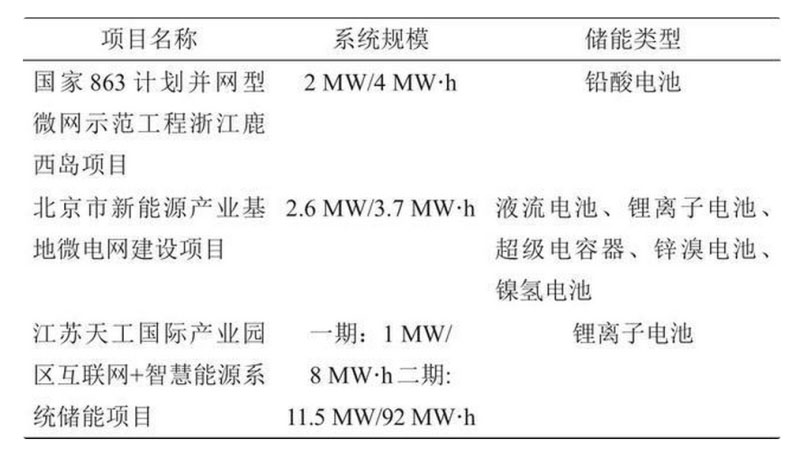 另外由于大工業(yè)用電的峰谷電價(jià)差相對于普通工商業(yè)峰谷電價(jià)差小,因此可通過峰谷套利與降低需量電費(fèi)相加的模式進(jìn)行盈利分析。為進(jìn)一步縮小成本提高收益,實(shí)現(xiàn)電池的充分利用,選用梯次電池代替新電池的儲能應(yīng)用模式逐漸推廣開來。2019年8月6日在深圳市比克工業(yè)園區(qū)投運(yùn)的2.15 MW/7.27 MW·h梯次電池儲能項(xiàng)目,采用三元及磷酸鐵鋰電池、兩充兩放的技術(shù)方案,實(shí)現(xiàn)削峰填谷、重要負(fù)荷應(yīng)急保障供電等功能。表6列舉了國內(nèi)目前已建成的部分儲能微電網(wǎng)項(xiàng)目。