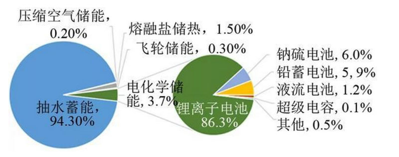 據(jù)中關(guān)村儲能產(chǎn)業(yè)技術(shù)聯(lián)盟(CNESA)統(tǒng)計(jì),截至2018年底,全球已投運(yùn)儲能項(xiàng)目累計(jì)裝機(jī)規(guī)模為181.0 GW,同比增長3.2%[2,3]。電化學(xué)儲能裝機(jī)為6.6254 GW,同比增長126.4%,占比為3.7%,較上一年增長2.0個(gè)百分點(diǎn)。各類儲能具體占比如圖1所示。目前,中國已投運(yùn)儲能項(xiàng)目裝機(jī)規(guī)模31.3 GW,占全球市場的17.3%。其中,電化學(xué)儲能是除抽水蓄能外裝機(jī)規(guī)模最大的儲能形式[4],累計(jì)1072.7 MW。同時(shí),電化學(xué)儲能也是目前各類儲能應(yīng)用中,除抽水蓄能之外應(yīng)用最廣泛、技術(shù)發(fā)展最快、產(chǎn)業(yè)基礎(chǔ)最好的儲能技術(shù)。以鋰離子電池、鉛酸電池、液流電池為主導(dǎo)的電化學(xué)儲能不僅在電池本體技術(shù)和系統(tǒng)集成技術(shù)層面取得了重大突破,并且在發(fā)電領(lǐng)域的場景應(yīng)用范圍也實(shí)現(xiàn)了重要擴(kuò)展。因此本文主要針對電化學(xué)儲能相關(guān)政策、技術(shù)及其應(yīng)用予以闡述。