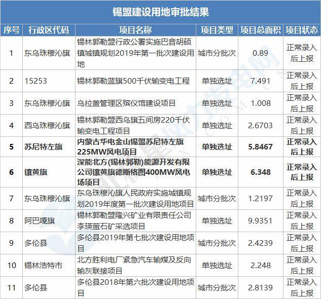 分別為:內(nèi)蒙古華電金山錫盟蘇尼特左旗225MW風(fēng)電項(xiàng)目、深能北方(錫林郭勒)能源開發(fā)有限公司鑲黃旗德斯格圖400MW風(fēng)電場(chǎng)項(xiàng)目、斯能阿巴嘎旗3號(hào)風(fēng)電場(chǎng)一期150MW風(fēng)電項(xiàng)目、華潤電力新能源投資有限公司太仆寺旗300MW風(fēng)電項(xiàng)目、內(nèi)蒙古華電蘇尼特左旗滿都拉圖一期100MW風(fēng)電項(xiàng)目、內(nèi)蒙古京能蘇尼特風(fēng)力發(fā)電有限公司30萬千瓦風(fēng)電項(xiàng)目;