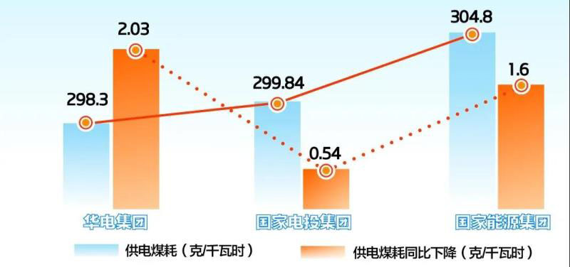 2019年,華電集團(tuán)供電煤耗完成298.3克/千瓦時,同比下降2.03克/千瓦時,實現(xiàn)了300克/千瓦時以下的歷史性突破。國家電投集團(tuán)供電煤耗同比降0.54克/千瓦時,為299.84克/千瓦時。國家能源集團(tuán)供電煤耗完成304.8克/千瓦時,同比下降1.6克/千瓦時。(華能集團(tuán)、大唐集團(tuán)數(shù)據(jù)略)