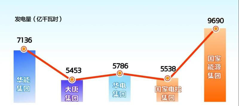 國家能源集團(tuán)發(fā)電量9690億千瓦時,同比增長1.65%,處在領(lǐng)跑位置。華能集團(tuán)完成發(fā)電量(國內(nèi))7136億千瓦時,同比增長1.56%。華電集團(tuán)完成實發(fā)電量5786億千瓦時,同比增長4.09%。國家電投集團(tuán)全力以赴增產(chǎn)增收,全年發(fā)電量5538億千瓦時,同比增長11.2%。大唐集團(tuán)完成發(fā)電量5453億千瓦時。