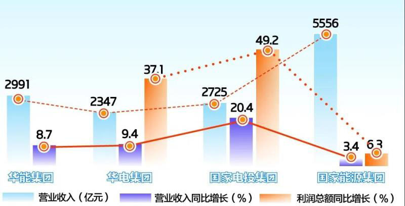 2019年,煤炭市場供需有所緩和、減費降稅力度加大、清潔能源進(jìn)一步緩解、資金市場趨于寬松,發(fā)電企業(yè)營業(yè)收入保持增長態(tài)勢。國家能源集團(tuán)全年營業(yè)收入5556億元,同比增長3.4%;利潤總額同比增長6.3%。華能集團(tuán)營業(yè)收入同比增長8.7%,為2991億元。國家電投集團(tuán)全年實現(xiàn)營業(yè)收入2725億元,同比增長20.4%;利潤總額同比增長49.2%。華電集團(tuán)全年實現(xiàn)銷售收入2347億元,同比增長9.4%;利潤總額同比增長37.1%。(大唐集團(tuán)數(shù)據(jù)略)