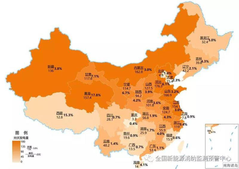 青海、西藏的光伏發(fā)電量占比超過15%,其余省份均低于7.5%。