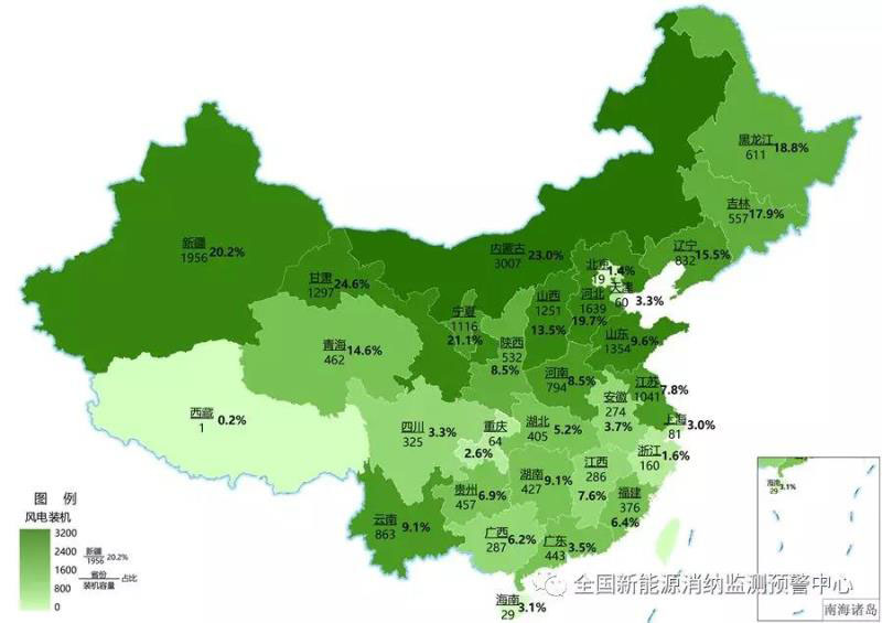 甘肅、內(nèi)蒙、寧夏、新疆的風電裝機占比超過20%;