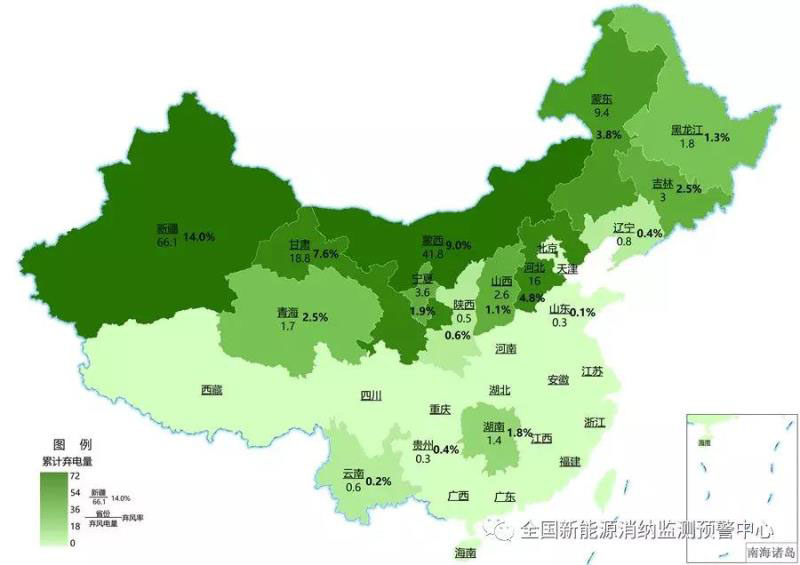 截至12月底各地區(qū)累計(jì)棄風(fēng)電量(億千瓦時(shí))及棄風(fēng)率