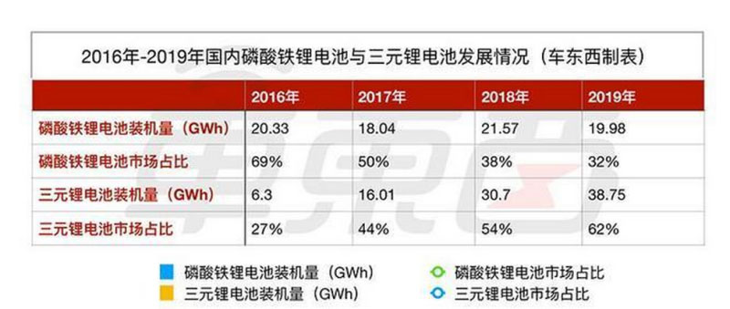 ▲2016年-2019年國內(nèi)磷酸鐵鋰電池與三元鋰電池發(fā)展情況對比