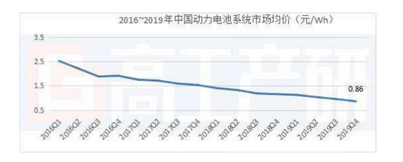 市場(chǎng)出現(xiàn)增量不增值的原因主要由于電池單體以及系統(tǒng)價(jià)格下降速度遠(yuǎn)大于電池單體出貨量增加速度。從季度價(jià)格走勢(shì)分布來(lái)看,2016-2019年整體價(jià)格呈現(xiàn)4%-10%不等的下降走勢(shì),2019年電池單體價(jià)格下降走勢(shì)維持在5%-10%之間,較2018年下降幅度更大。2019年4季度動(dòng)力電池系統(tǒng)不含稅價(jià)格為0.82~0.95元/Wh,較2018年4季度動(dòng)力電池系統(tǒng)價(jià)格下降25.9%。GGII預(yù)測(cè),2020年隨著電池系統(tǒng)集成化提升以及新工藝的使用,動(dòng)力電池價(jià)格有望進(jìn)一步下降。