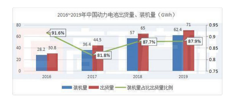 GGII調(diào)研數(shù)據(jù)顯示,2019年中國(guó)動(dòng)力電池出貨量為71GWh,同比增長(zhǎng)9.4%,相比2018年,增長(zhǎng)速率有所放緩。減緩原因主要受新能源汽車(chē)市場(chǎng)產(chǎn)銷(xiāo)量下降影響。2019年中國(guó)新能源汽車(chē)產(chǎn)量117.7萬(wàn)輛,同比下降3.4%。從動(dòng)力電池出貨量及裝機(jī)量的差距來(lái)看,2017-2019年裝機(jī)量占比出貨量比例逐漸穩(wěn)定,且比例有呈減小趨勢(shì)。