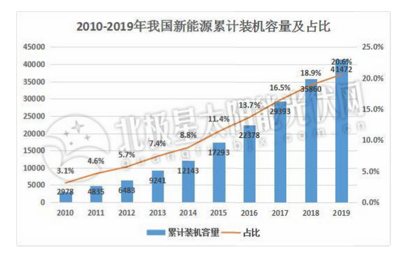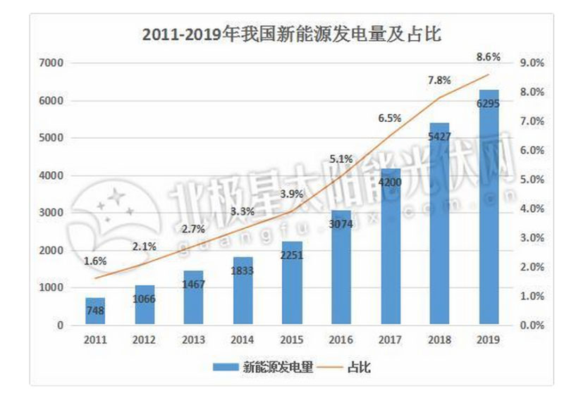 近年來(lái),我國(guó)新能源裝機(jī)量及發(fā)電量始終保持增長(zhǎng)態(tài)勢(shì),新能源發(fā)電量在總發(fā)電量中的占比也逐年提高,統(tǒng)計(jì)數(shù)據(jù)顯示,2019年我國(guó)新能源發(fā)電量已經(jīng)達(dá)到6295億千瓦時(shí),占總發(fā)電量的8.6%。
