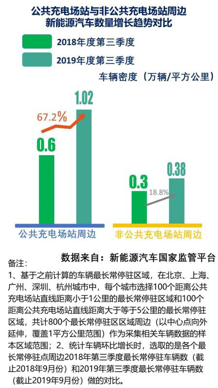 上圖則更為直觀的說(shuō)明公共充電設(shè)施和新能源汽車市場(chǎng)發(fā)展的促進(jìn)關(guān)系,新能源汽車國(guó)家監(jiān)管平臺(tái)通過(guò)平臺(tái)內(nèi)有效監(jiān)測(cè)車輛數(shù)據(jù),以季度作為時(shí)間單位,在全國(guó)范圍進(jìn)行測(cè)算,發(fā)現(xiàn)公共充電場(chǎng)站能夠明顯帶動(dòng)周邊新能源汽車的數(shù)量增長(zhǎng),公共充電場(chǎng)站周邊車輛密度(萬(wàn)輛/平方公里)從2018年的0.6增長(zhǎng)到2019年1.02,環(huán)比增長(zhǎng)67.2%,而非公共充電場(chǎng)站周邊車輛密度2018年是0.3,2019年微漲至0.38,環(huán)比增長(zhǎng)僅為18.8%。數(shù)據(jù)指明有公共充電場(chǎng)站周邊的新能源汽車市場(chǎng)增長(zhǎng)速度三倍于周邊無(wú)公共充電場(chǎng)站。