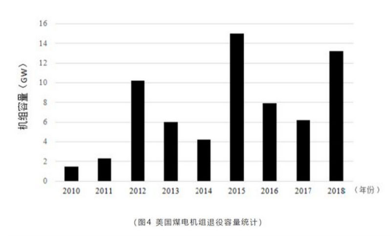 根據(jù)美國能源信息署統(tǒng)計數(shù)據(jù),2010年至2018年美國陸續(xù)退役煤電機組共計0.894億kW,284座煤電發(fā)電廠退役,剩余246座。美國煤電機組退役容量統(tǒng)計如圖4所示。