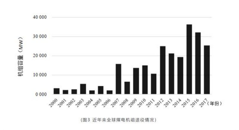 根據(jù)“全球燃煤電廠追蹤系統(tǒng)”數(shù)據(jù),在過去10年,全球范圍內(nèi)燃煤電廠機組的退役趨勢出現(xiàn)了大幅的上升,特別是歐美工業(yè)發(fā)達國家煤電機組的關停數(shù)量不斷增長。圖3為近年來全球煤電機組退役情況。由圖3可見:2009—2011、2012—2014、2015—2017年分別有42 334、65 877、97 193 MW機組退役;其中服役年限最長的已達60多年,有些國家服役30~60年的煤電機組占比達90%以上。
