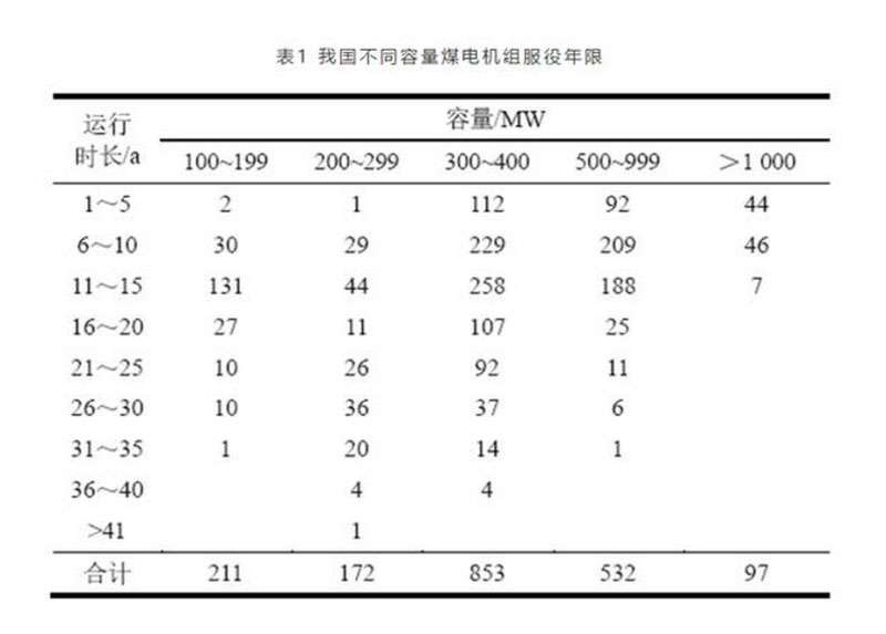 根據(jù)中國電力企業(yè)聯(lián)合會可靠性管理中心統(tǒng)計數(shù)據(jù),截至2017年底,我國100 MW及以上各種不同容量的在役煤電機組服役年限統(tǒng)計見表1。