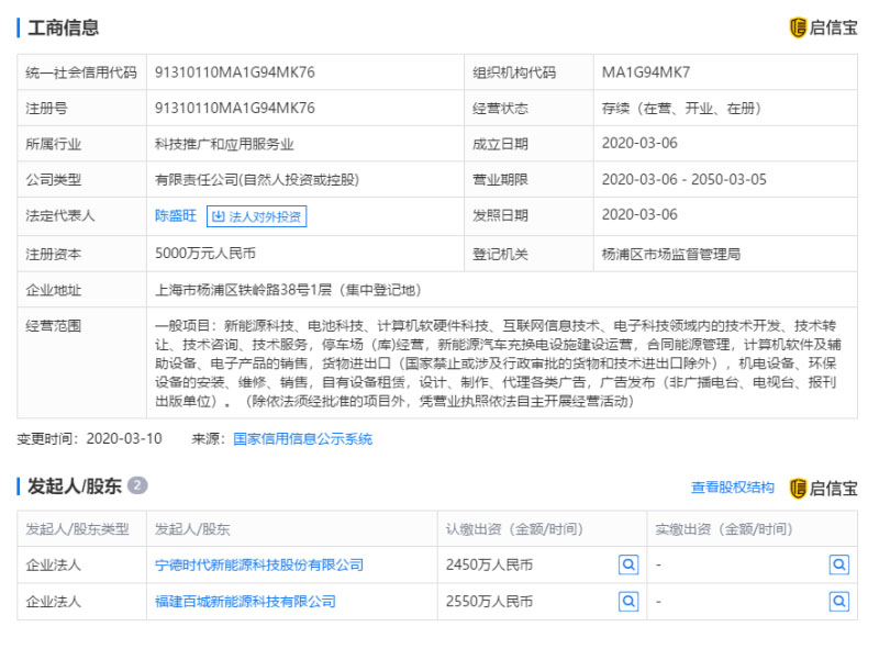 快卜新能源的股東為寧德時代新能源科技股份有限公司(以下簡稱寧德時代)和福建百城新能源科技有限公司(以下簡稱百城新能源),其中寧德時代認(rèn)繳出資2450萬元,持股49%;百城新能源認(rèn)繳出資2550萬元,持股51%。