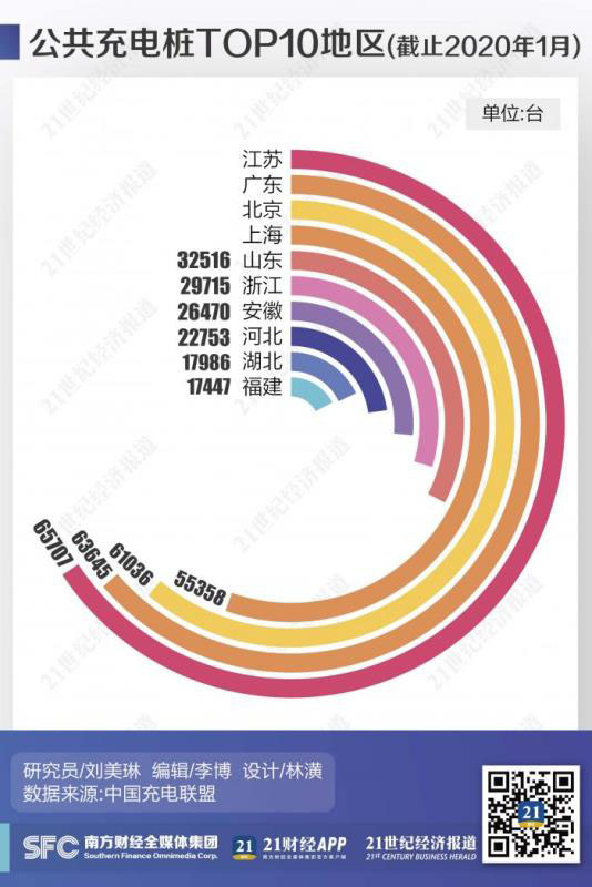 21世紀(jì)經(jīng)濟研究院梳理了截至2020年1月的最新數(shù)據(jù),結(jié)果顯示,公共充電樁保有量前十名的地區(qū)分別為江蘇、廣東、北京、上海、山東、浙江、安徽、河北、湖北和福建?;浱K京滬領(lǐng)先優(yōu)勢明顯,與2019年相比,除江蘇、廣東位置對調(diào)外排名無其余變化,頭部格局已較為固定。