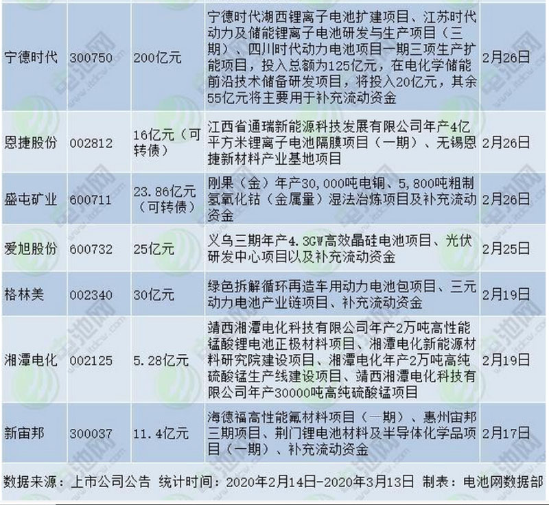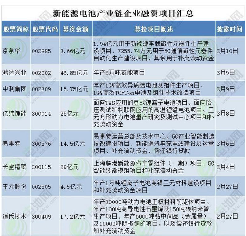 以上15家企業(yè)融資擴產(chǎn)項目涉及動力電池、正極材料、鈷鋰資源、隔膜、電解液、電池回收、氫能、太陽能電池、5G、新能源汽車充電站、新能源汽車零部件等多個領(lǐng)域。