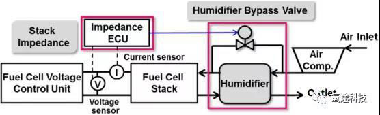 本田CLARITY燃料電池系統(tǒng)的陰極回路具有加濕器,并與旁通閥并聯(lián)?;贑CM含水量和電堆阻抗的關(guān)系特性,依據(jù)測得的電堆阻抗,調(diào)節(jié)旁通閥開度,定量地控制進(jìn)堆氣體濕度,確保電堆CCM含水量控制在最佳運行濕度的上限和下限內(nèi),從而令堆內(nèi)濕度維持在適宜的水平。