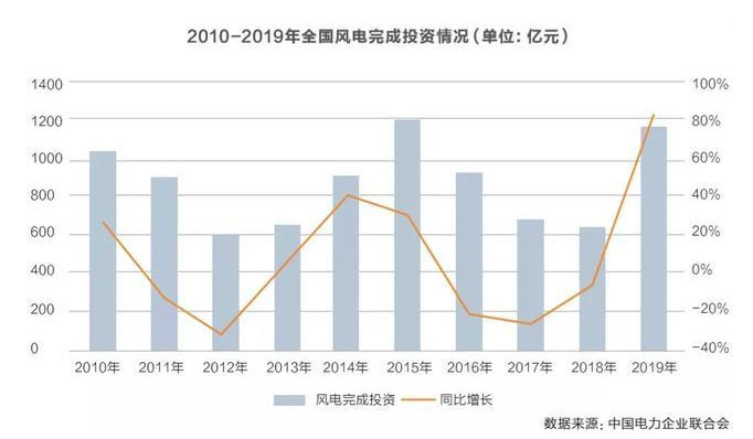 為鎖定高電價(jià),開發(fā)商不惜重金“搶并網(wǎng)”。電力行業(yè)統(tǒng)計(jì)數(shù)據(jù)顯示,2019年全國主要發(fā)電企業(yè)電源工程完成投資 3139億元,同比提高12.6%。其中,水電814億元,同比增長16.3%;火電630億元,同比下降20.0%;核電335億元,同比下降25.0%;風(fēng)電1171億元,同比增長82.4%。在各主要能源類型中,風(fēng)電投資增幅最大。