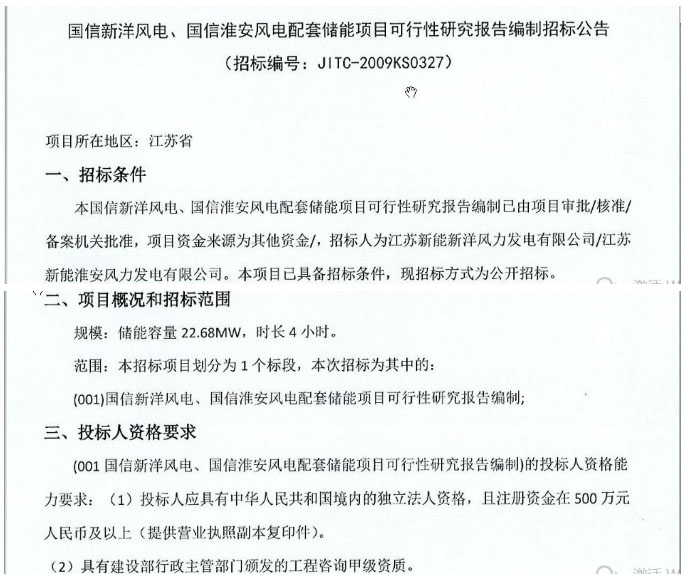 附國信新洋風電、國信淮安風電配套儲能項目可行性研究報告編制招標公告: