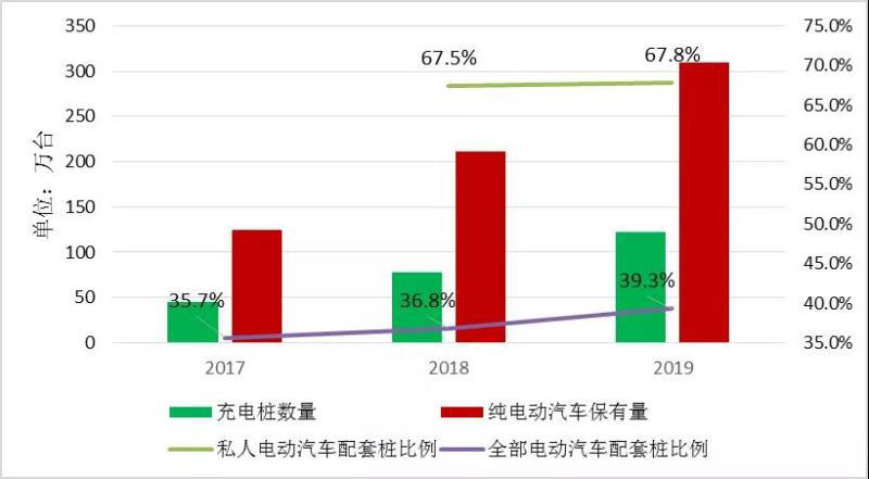 圖2 2017-2019年充電樁與純電動汽車保有數(shù)量及電動汽車配套樁比例