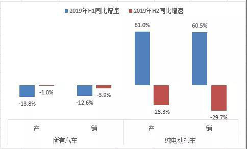 圖1 2019年上半年(H1)和下半年(H2)汽車及純電動汽車產(chǎn)、銷同比變化情況