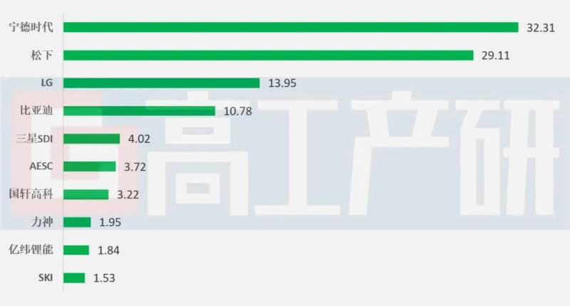 2019年全球動力電池裝機量TOP10企業(yè)(GWh)
