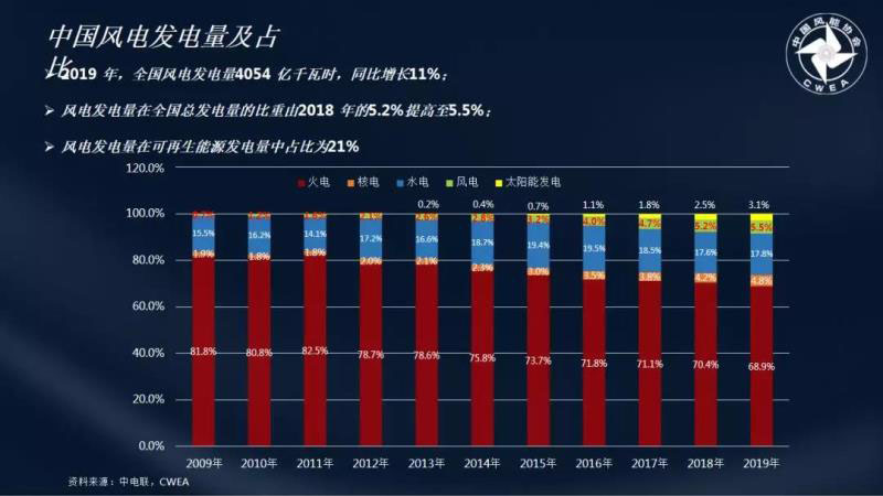 據(jù)秦海巖秘書長介紹,在風(fēng)電裝機量方面,2019年中國風(fēng)電新增裝機容量2578萬千瓦,同比增長25%,累計并網(wǎng)2.09億千瓦,同比增長14%。在風(fēng)電發(fā)電量方面,2019年全國風(fēng)電發(fā)電量達(dá)到4054億千瓦時,同比增長11%,在全國總發(fā)電量的比重也從5.2%上升至5.5%。