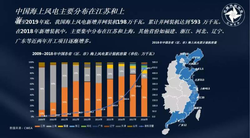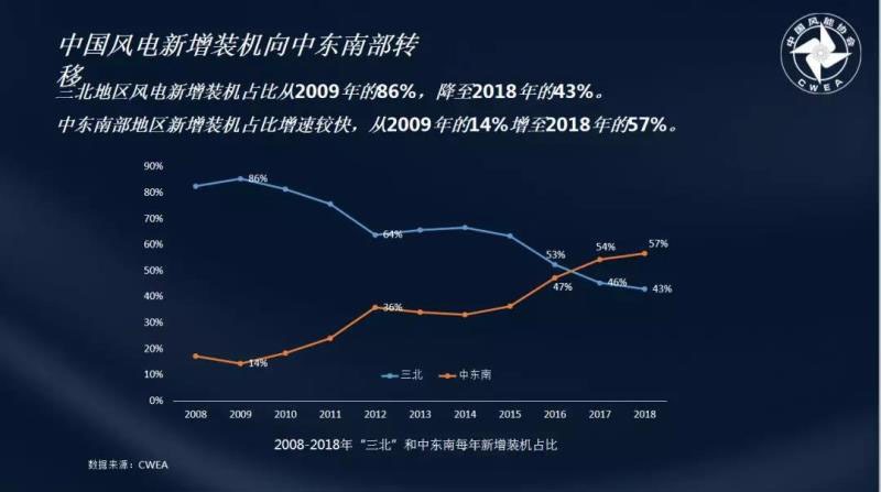 同時,風(fēng)電裝機結(jié)構(gòu)有了很大的變化,以往新增裝機數(shù)量較大的“三北”地區(qū)逐漸落后于中東南部地區(qū),2018年三北地區(qū)和中東南地區(qū)新增裝機數(shù)量占總裝機數(shù)量比率分別為43%和57%。東南沿海地區(qū)海上風(fēng)電的龍頭仍舊是江蘇(3.1GW)和上海(0.4GW),同時,福建、浙江等省份也在逐漸增加海上風(fēng)電的裝機容量,未來廣東將成為潛力最大的海上風(fēng)電市場。
