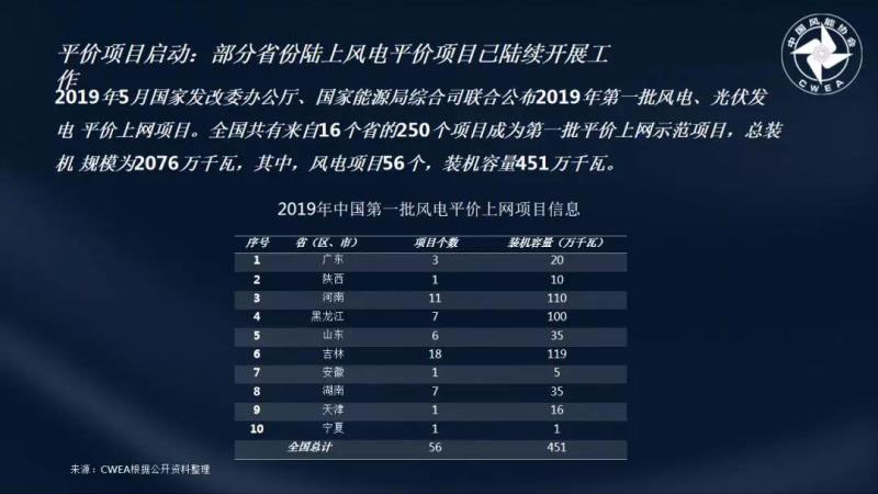 在2019年5月國家發(fā)改委辦公廳、國家能源局綜合司聯(lián)合公布2019年第一批風(fēng)電、光伏發(fā)電平價上網(wǎng)項目中,全國共有來自16個省的250個項目成為第一批平價上網(wǎng)示范項目,總裝機規(guī)模為2076萬千瓦,其中,風(fēng)電項目56個,裝機容量451萬千瓦。
