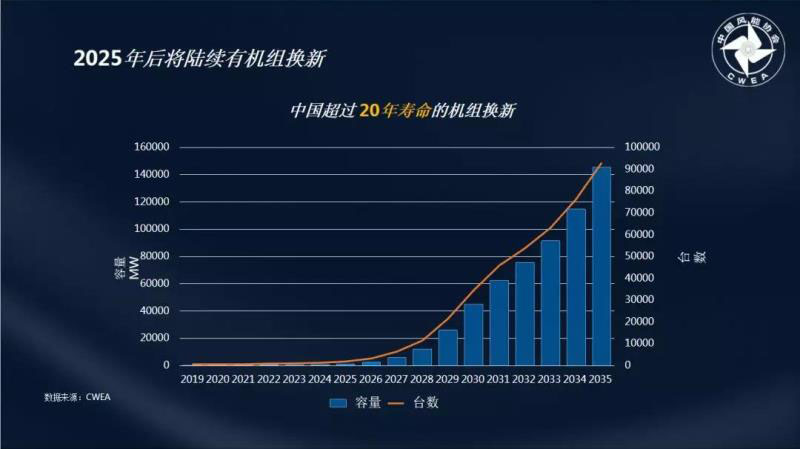 在未來,2020-2025年間的風(fēng)電市場將從已核準(zhǔn)搶電價、已核準(zhǔn)轉(zhuǎn)平價、平價基地等方面轉(zhuǎn)向平價項目、分散式風(fēng)電項目和換新項目。由于風(fēng)電機組的壽命普遍在20~25年,在2030年~2035年間,有大量的風(fēng)電機組需要換新。所以,在未來的風(fēng)電市場中,風(fēng)電運維市場規(guī)模將不斷擴(kuò)大。根據(jù)預(yù)測,2035年,達(dá)到壽命上限的風(fēng)電機組容量將達(dá)到150GW,臺數(shù)將超過9萬臺。
