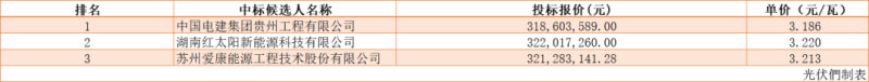 根據(jù)公示,中國(guó)電建集團(tuán)貴州工程有限公司以總價(jià)318,603,589元,單價(jià)3.186元/瓦的報(bào)價(jià)成功中標(biāo)。需要注意的是,根據(jù)招標(biāo)公告,該EPC范圍不包含外線(xiàn)及升壓站等費(fèi)用。