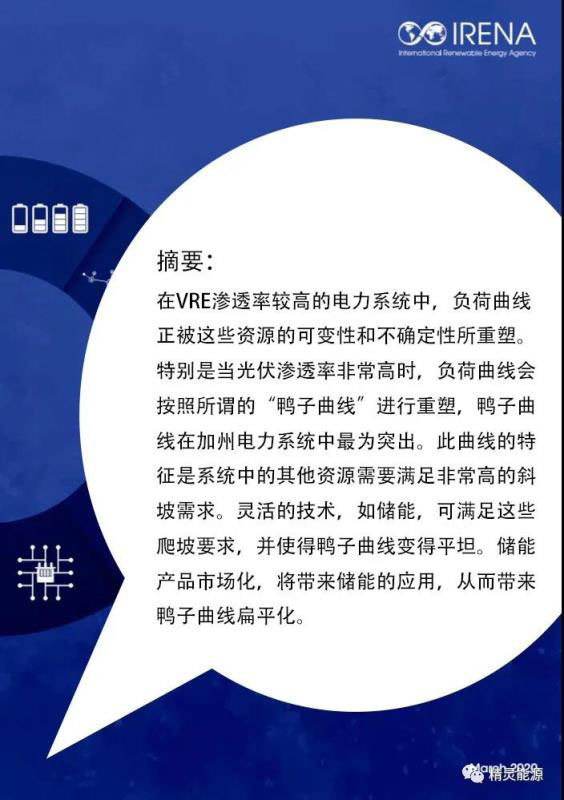 在VRE滲透率較高的電力系統(tǒng)中,負(fù)荷曲線正被這些資源的可變性和不確定性所重塑。特別是當(dāng)光伏滲透率非常高時(shí),負(fù)荷曲線會按照所謂的“鴨子曲線”進(jìn)行重塑,鴨子曲線在加州電力系統(tǒng)中最為突出。此曲線的特征是系統(tǒng)中的其他設(shè)備需要滿足非常高的爬坡需求。靈活的技術(shù),如儲能,可滿足這些爬坡的要求,并使得鴨子曲線變得平坦。儲能產(chǎn)品市場化,將帶來儲能的應(yīng)用,從而帶來鴨子曲線扁平化。