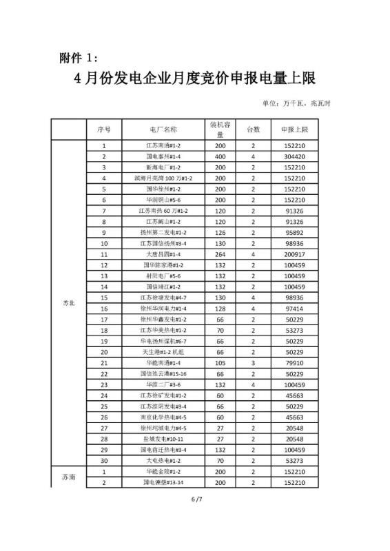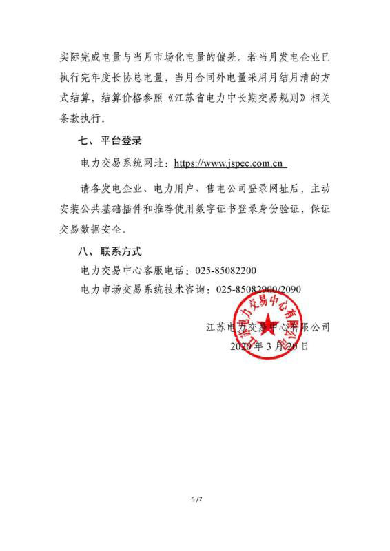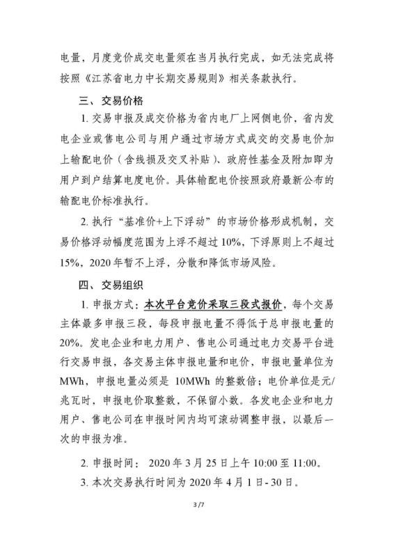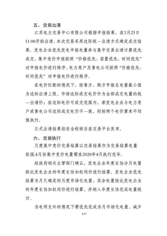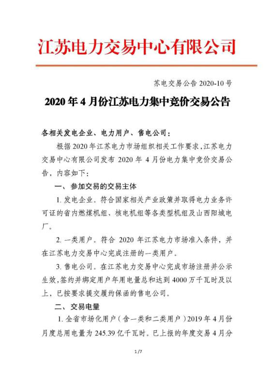 2020年4月份江蘇電力集中競價交易公告