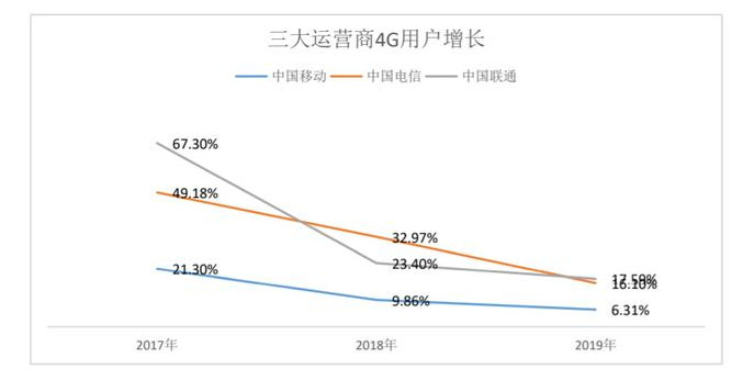 我們看看2017年至2019年三大運(yùn)營(yíng)商4G用戶(hù)同比增長(zhǎng)率。