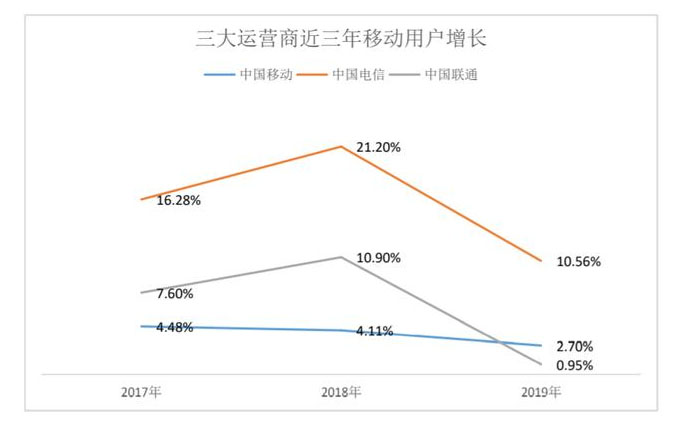 如果看2017年至2019年移動(dòng)用戶(hù)同比增長(zhǎng)率,也許我們能清晰的感受到運(yùn)營(yíng)商移動(dòng)用戶(hù)增幅放緩的局面。